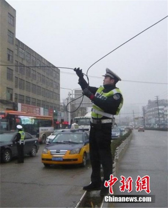 寫真は雨の中、電線を掲げて車両を通す交通警察の潘志俊さん。
