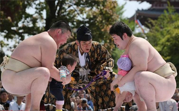 日本の伝統(tǒng)的な泣き相撲は関取が赤ちゃんを泣かせ、泣き聲を競うイベントである。赤ちゃんは可愛らしい著物や腹當(dāng)て、頭巾を見につけて戦い、早く泣いた赤ちゃんが健康な子として勝ちとなる。
