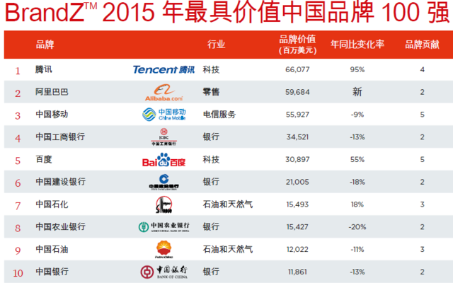 具體的な名前を挙げると、科學(xué)技術(shù)企業(yè)のテンセント(騰訊)はブランド価値が660億7700萬ドルでトップに立った。2位は小売企業(yè)のアリババ(阿里巴巴)で596億8400萬ドル、3位は電気通信サービスの中國移動で559億2700萬ドルだった。