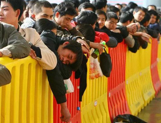 2010年1月20日午後、寧波國際エキシビションセンターの臨時乗車券販売所で、長い行列の中で柵にもたれて居眠りする広西壯(チワン)族自治區(qū)出身の若者、梁獻貴さん。彼は3年ぶりに帰省するところだった。
