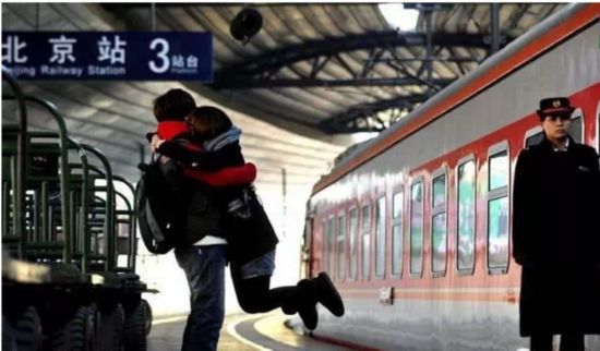 2011年1月26日、北京駅で、列車の発車前に抱き合って別れを惜しむ女性と男性。
