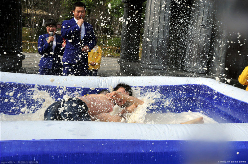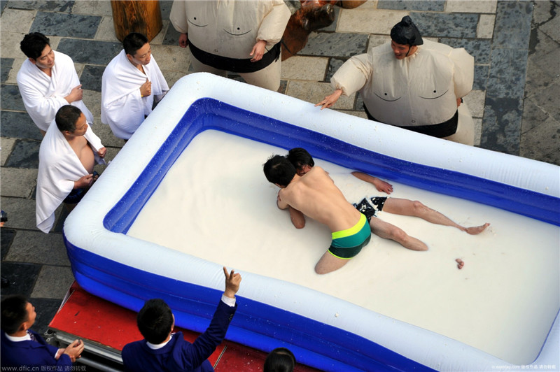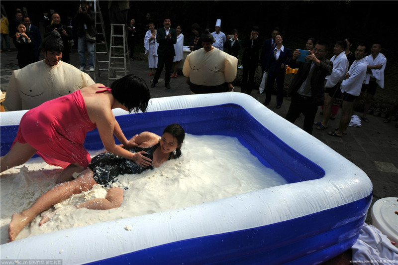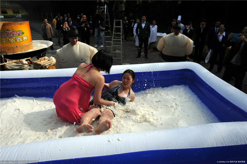 広東省佛岡県は豆腐が有名で、省の無(wú)形文化遺産に指定される。2月1日、同県にあるリゾート地·森波拉火山溫泉では、特別な相撲が行われた。なんと、豆腐の中での相撲だ!白くて柔らかい豆腐に包まれながらする激しい試合は、一生忘れられない體験となったことだ。情報(bào)筋によると、4.8メートル長(zhǎng)さ、3.6メートル広さの試合場(chǎng)には豆腐や牛乳約2トンが入るという。