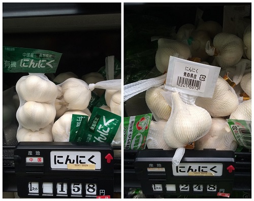 日本のスーパーで売られている中國産ニンニクと國産ニンニクの価格対比。輸入中國産ニンニクは3つでわずか158円。國産ニンニクは1個(gè)で248円