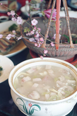 春になると蘇州では肉と筍の煮込みが食卓にのぼる。地面から顔を出した筍は一番柔らかい時期だ。春の雨が降ると、蘇州では瑞々しい筍が顔を出す。一冬塩漬けにした肉もそろそろ食べ頃だ。蘇州人は春の筍に新鮮な豚足を加え、塩漬けにした肉と一緒に鍋で弱火で煮込むという革新的な方法で調(diào)理する。このスープは筍のやわらかさと肉や豚骨の味わいが相まって、とても味わい深い。まさに蘇州の春の味と言える。