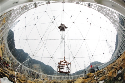 中國科學院國家天文臺FASTプロジェクト弁公室が発表した情報によると、中國の500メートル球面電波望遠鏡(FAST)の最後のメインケーブルの取り付けが5日午前11時45分に終了し、ケーブルネットの製造と取付が順調(diào)に完了した。人民日報が伝えた。