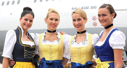 ルフトハンザ航空は2005年、ドイツビールの祭典「オクトーバーフェスト」にあわせて、フライトアテンダントの制服としてバイエルン地方の伝統(tǒng)衣裝を採(cǎi)用した。また、同社は14年、ミュンヘンと北京、サンパウロ、メキシコシティを結(jié)ぶ長(zhǎng)距離航空線のフライトアテンダントの制服として同衣裝を採(cǎi)用した。黃色ブラウスには蘭の花がプリントされ、水色のスカートと合わせている。