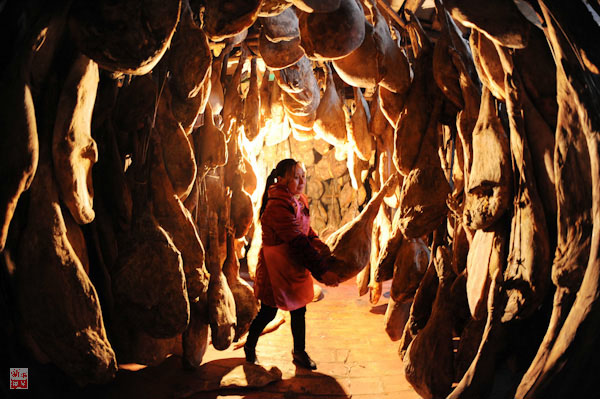 盤県のハムは歴史が長い。形は琵琶に似て色は黃色、肉は薄いピンクやばら色で、脂身は白く、濃厚な味でやわらかい。肉を切って成形し、塩で漬けて押し、洗って乾燥させ、発酵させるといった6段階を経て作られる。