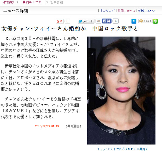 多くの海外メディアが、チャン?ツィイーの婚約を報道 相手には觸れず  (5)