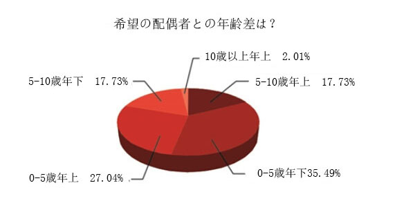 同サイトの「配偶者との年齢差」に関する調査で、「姉さん女房」を「受け入れられる」と答えた男女回答者は16.5%。女性回答者だけを見ると、6.27%が、「5歳以上年下」の彼氏を受け入れられるとし、9.18%が「0-5歳年下」の彼氏を受け入れられるとした。一方、男性回答者だけを見ると、5.99%が「5-10歳年上」、8.77%が「0-5歳年上」、2.56%が「10歳以上年上」の彼女を受け入れられるとした。