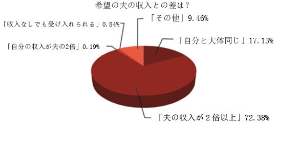 調(diào)査では、獨身女性の72.38%が、男性の側(cè)の収入が自分の「2倍以上」であることを望んでいる。一方、収入が自分より多い女性を「受け入れられる」とした男性の割合はわずか1.31%にとどまっている。特筆すべくは、収入のない男性を「受け入れられる」女性がわずか0.84%である點だ。その他、収入が自分と大體同じである男性と交際することを「受け入れられる」女性はわずか17.13%にとどまっている。つまり、獨身の女性は、収入の高い男性を望んでいるということだ。