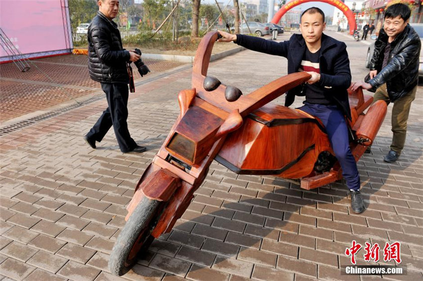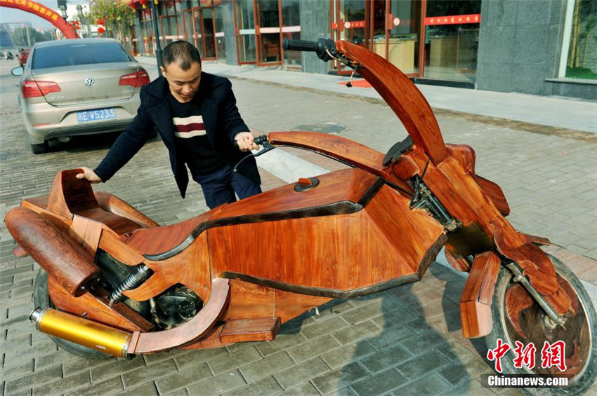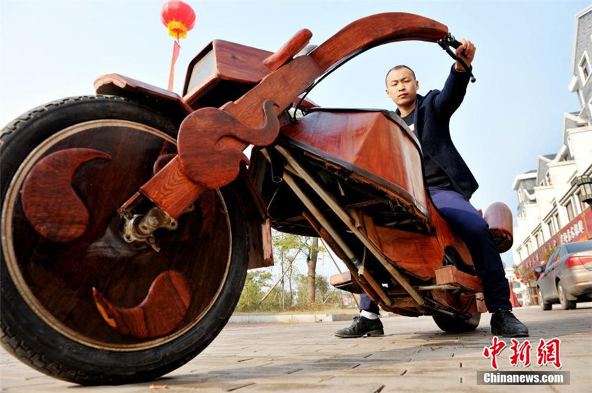 スポーツカーの他に、余さんは1ヶ月余りの時間と2萬元(1元は約19.3円)以上の資金を費やし、全長2.7メートル、高さ1.25メートル、幅0.9メートルの木製バイク「炫風」も作った。(編集YF)