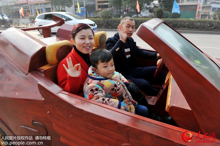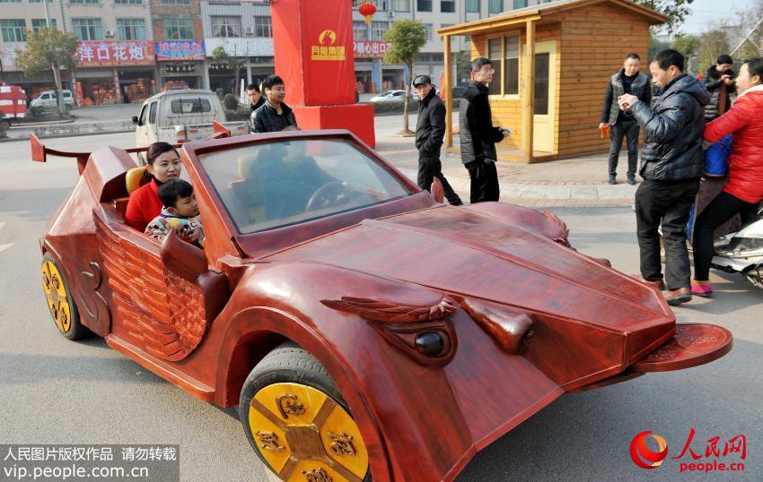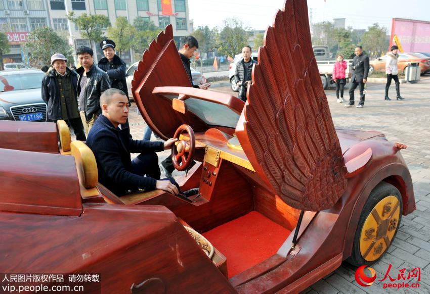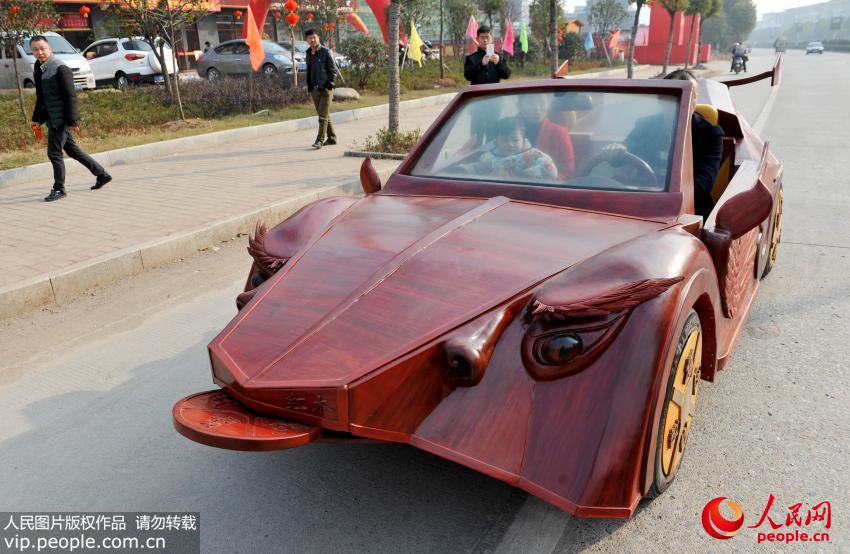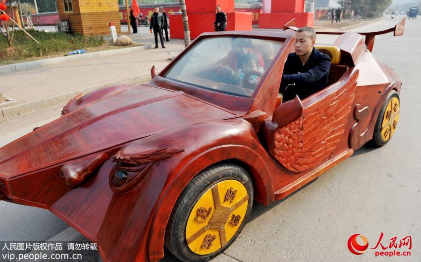 江西省広豊県銅鈸山の農(nóng)民アーティスト余接濤さんは2月9日、手作りの木製オープンカー「金蟬」を運転し街に出た。學歴が中卒しかない余さんは、現(xiàn)地で木彫アーティスト?彫刻家として働いている。余さんは先ほど半年余りの時間を掛けて、全長4メートル、高さ1.5メートル、幅1.5メートル、最高時速30キロのスポーツカーを作った。この車は2座席のオープンカーで、羽を持ち、銅銭を口にくわえる「金蟬」をイメージしたデザインとなっている。この車はタイヤやエンジンなど重要な部分を除き、全體構(gòu)造と內(nèi)裝はすべて沈香、質(zhì)の高いシタン、一般的なシタンによって作られている。これは中國初の手作りの木製スポーツカーだ。