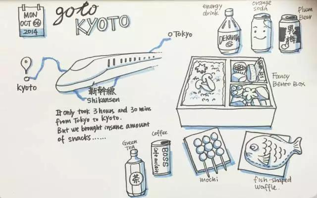 東京で慌ただしく一日を過ごした後、計畫通り京都へ向かった。新幹線に乗れば、東京から京都まではわずか約3時間半。しかし、私たちはピクニック気分を味わいたくて、有名な新幹線の駅弁を購入した後、けらえいこ原作のTVアニメ「あたしンち」のお父さんをまねて、ビールとつまみも買った。