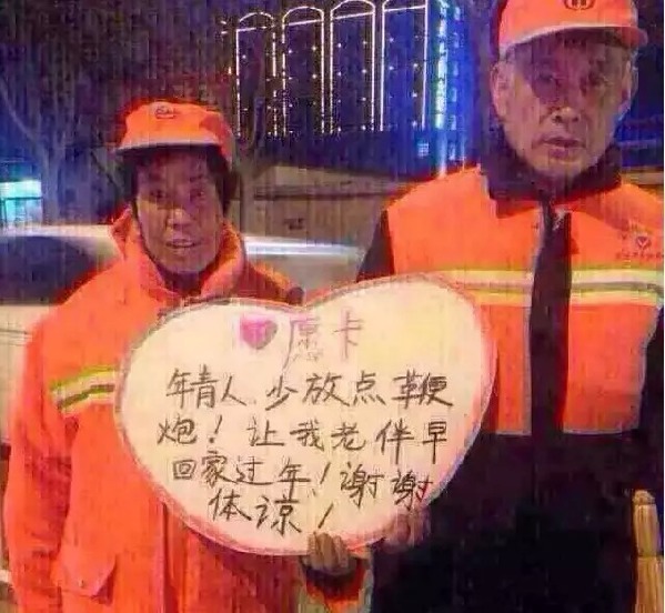 最近、ネット上で春節(jié)(舊正月、今年は2月19日)に爆竹の使用を減らそうと呼びかける寫真が凄まじい勢いで転載されている。この寫真には、街角で清掃員夫婦がハート型のカードを持って立っている姿が映っている。カードには「若者へ、爆竹の使用はなるべく控えめ目に。我々老夫婦が早目に家に帰って新年を迎えられるように。ご理解いただけたら嬉しいです」と書かれていた。この寫真は多くの人を感動させるとともに、多くの職業(yè)に対する共感を激しく揺り起こした。程なくしてある人が、「春節(jié)はニュースを見るのをなるべく控え目に。記者たちがゆっくり新年を過ごせるように」「春節(jié)は宅配便の使用をなるべく控え目に。宅配便の配達員がゆっくり新年を過ごせるように」というパロディを書き込んだ。