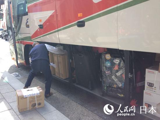 20日、中國(guó)人観光客が購(gòu)入した商品を社內(nèi)に運(yùn)び入れるバスの運(yùn)転手