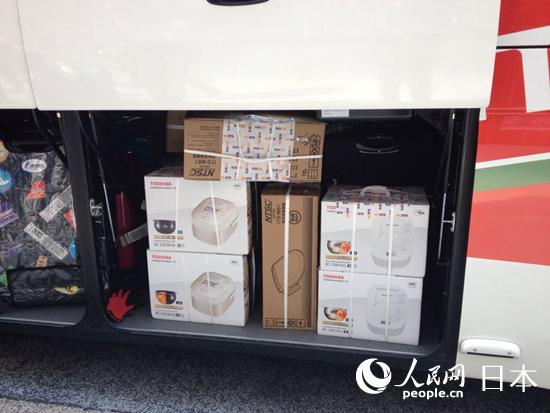 中國人観光客が購入したさまざまな商品が置かれている大型観光バスのトランクの中