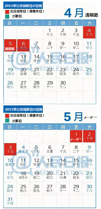 今年の清明節(jié)、メーデー(労働節(jié))、端午節(jié)、中秋節(jié)、國慶節(jié)の休暇日程は次の通り。