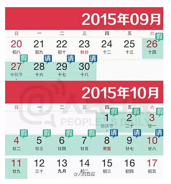 (5)中秋節(jié)と國慶節(jié):3日間休暇を取って12連休にする。もしくは6日間休みをとって16連休にする。