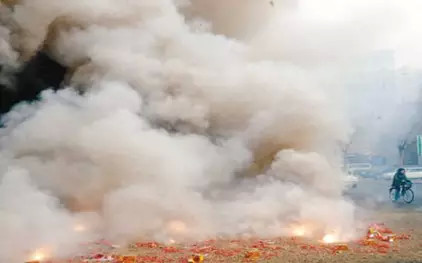 春節(jié)連休中、あちこちで爆竹の音が響き渡り、全國各地で「煙霧に覆われた都市」が誕生した。舊暦大晦日、130都市で花火と爆竹の使用が禁止され、530都市以上では、使用の制限措置が発表された。だが、「史上最も厳しい禁止令」が敷かれたにもかからわず、全國各地では爆竹によってPM2.5濃度は急上昇、測定器による測定が不能となるケースが相次いだ。2月18日(舊暦大晦日)午後8時から19日(元旦)の午前10時までに、中國全國で、大気の質(zhì)が6級(深刻な重度汚染)レベルに達した都市は106都市に上り、このうち、河北、遼寧、北京などの省市では、深刻な重度汚染の狀態(tài)が継続した。