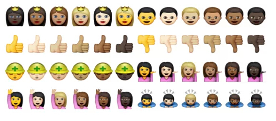 人の顔の絵文字では、6種類の肌の色を選択できるようになった。また同性愛者の「家族」を示す絵文字、32カ國の國旗、さまざまな民族の服裝や食べ物が追加された。