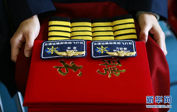 2人に渡されるパイロットの肩章、バッヂ、任命書。