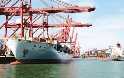 寫真:3月8日、江蘇省連雲(yún)港市の港灣ふ頭で輸出入貨物の積み卸しが活発に行われている様子。