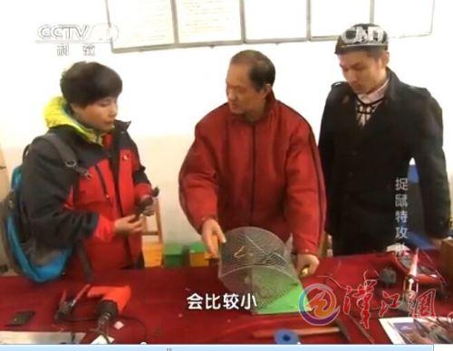 CCTVの記者にネズミ捕り器の原理を紹介する馮さん(真ん中)