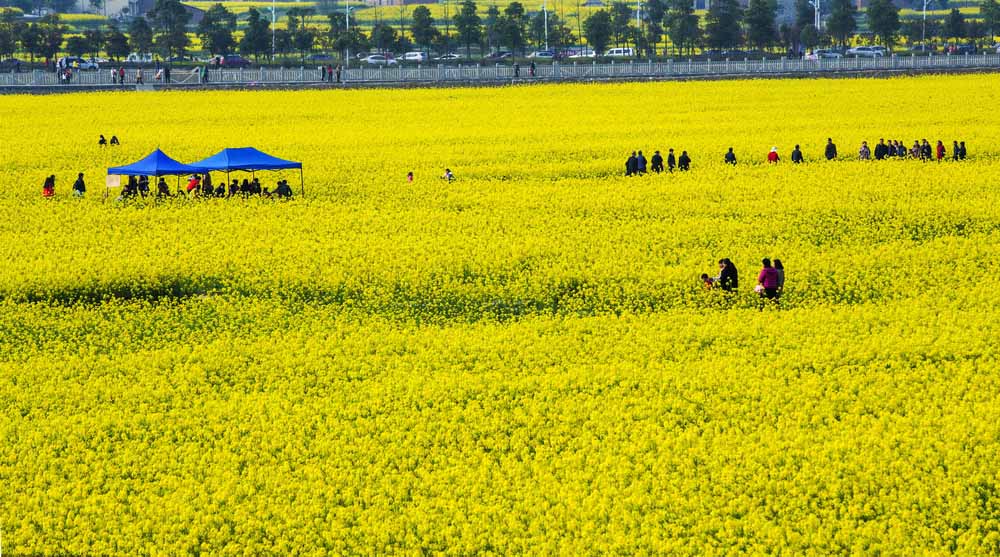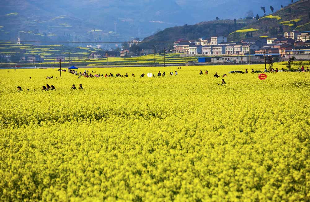寫真は10日、重慶市南川區(qū)の菜の花畑の間を歩く観光客。早春の3月、中國の一部の南方地域では菜の花が満開のシーズンを迎え、金色に輝く花が大地を覆い、春のムードを漂わせた。新華社が伝えた。(編集YH)
