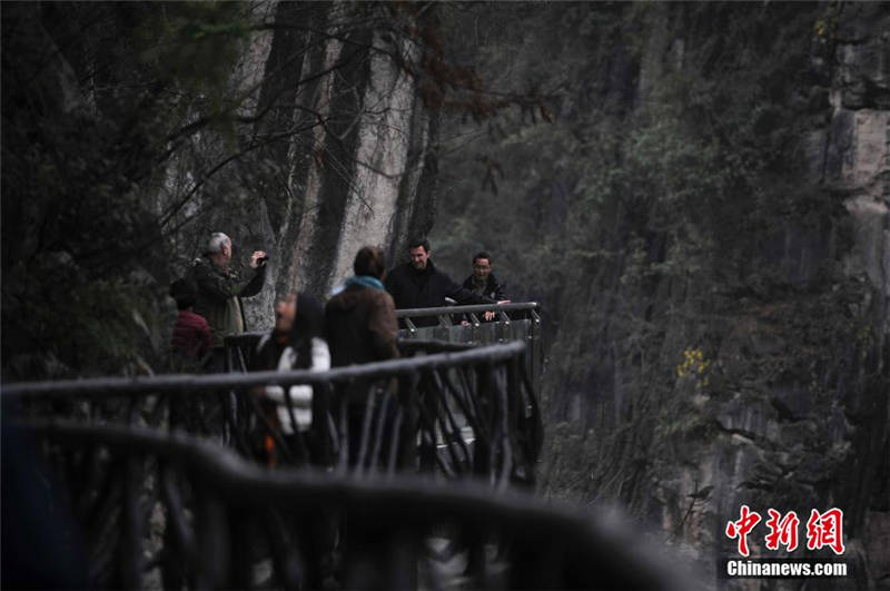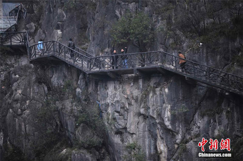 重慶市黔江區(qū)武陵山にある峽谷景勝地の絶壁の上に設(shè)置された長(zhǎng)さ800メートル以上、谷底までの高さは最大で500メートルにもなる展望空中桟道が、近く竣工?公開される見込みだ。寫真は一足早く峽谷の空中桟道を體験する観光客。中國(guó)新聞網(wǎng)が11日付で伝えた。(編集YH)