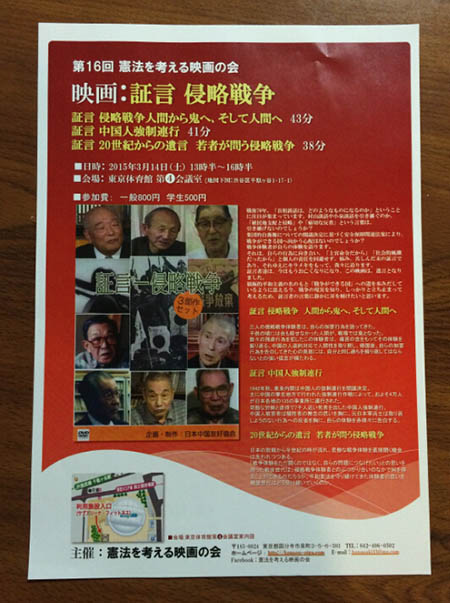 日本の市民団體が上映したドキュメンタリー『証言-侵略戦爭』三部作のポスター(劉軍國?人民日報記者撮影)