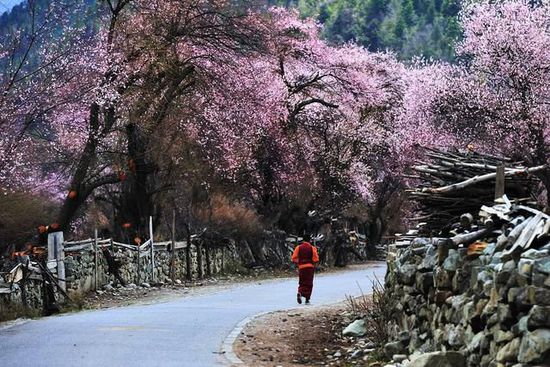 遠(yuǎn)くには氷河の雪山、近くには桃の花の下に色鮮やかなチベット式の民家が強(qiáng)烈なコントラストを見せ、美しい絵のような風(fēng)景を見せている。