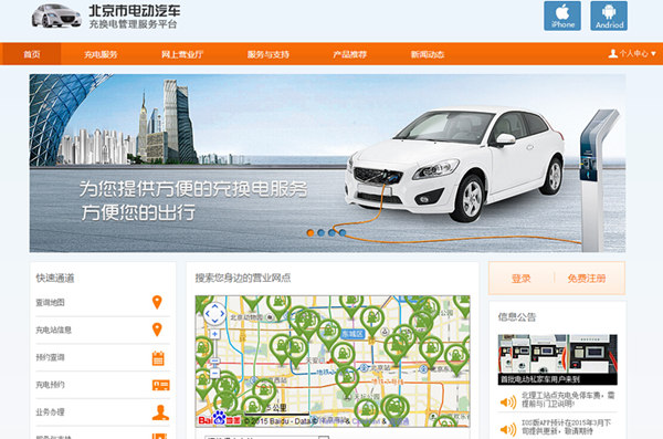 ▽北京市電気自動車充電?電池交換管理サービスプラットフォーム(http://www.evehicle.cn/)にアクセスする
