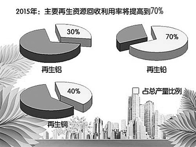 これらの指導(dǎo)意見(jiàn)?実施案によると、中國(guó)の主な再生可能資源の回収利用率は2015年中に70%に達(dá)することになる。うち、年間総生産量に占める再生銅の比率は40%、再生アルミは30%、再生鉛は70%に引き上げられる??萍既?qǐng)?bào)が伝えた。