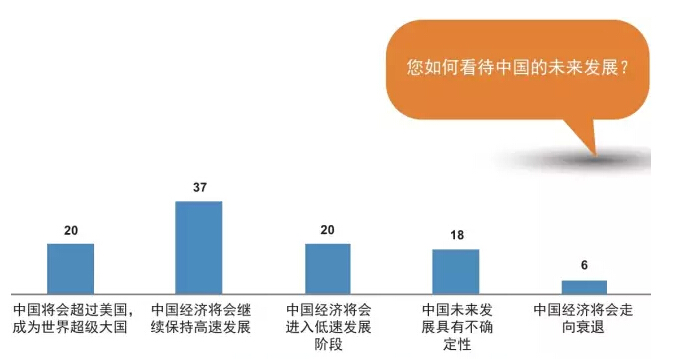 中國の將來の発展について、「中國は米國を抜いて世界の超大國になる」との回答は20%、「中國経済は高度成長を継続する」との回答は37%、「中國経済は低成長段階に入る」との回答は20%、「不確定性がある」との回答は18%、「中國経済は衰退へ向かう」との回答はわずか6%だった。中國の將來の発展については、先進(jìn)國より途上國の方が有望視している。