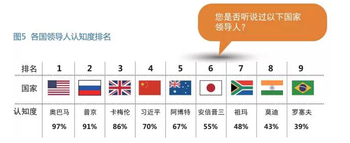 9カ國首脳の知名度では、習近平國家主席が70%で4位につけた。1位は米國のオバマ大統領(97%)、2位はロシアのプーチン大統領(91%)、3位は英國のキャメロン首相(86%)だった。