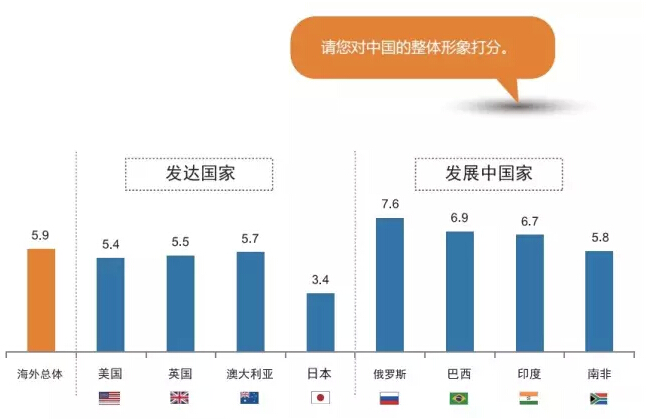 2013年の調(diào)査と比べ、中國全體のイメージ得點(diǎn)は0.8點(diǎn)上昇した(10點(diǎn)満點(diǎn))。海外8カ國中、中國のイメージに最も高い點(diǎn)をつけたのはロシアで7.6點(diǎn)、最も低い點(diǎn)をつけたのは日本で3.4點(diǎn)だった。