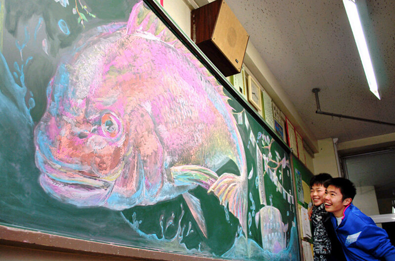 『朝日新聞』の報(bào)道によると、朝登校すると教室の黒板いっぱいいにチョークで絵が描かれているという面白いことが近ごろ日本の首都圏の小中學(xué)校で相次いでいる。この活動の発起者は武蔵野美術(shù)大學(xué)の數(shù)人の學(xué)生である。このような作品はすぐに消されてしまうが、蕓術(shù)の楽しさを児童の心に深く殘すことができる。