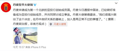 同大使館の公式「微博」(ウェイボー)によると、フリース?アルネ?ペーテルセン大使は、「今回の決定を非常にうれしく思う。デンマークと中國の良好な関係を土臺(tái)として、(AIIBへの)參加はごく當(dāng)たり前のことだ」と述べたという。(編集KS)
