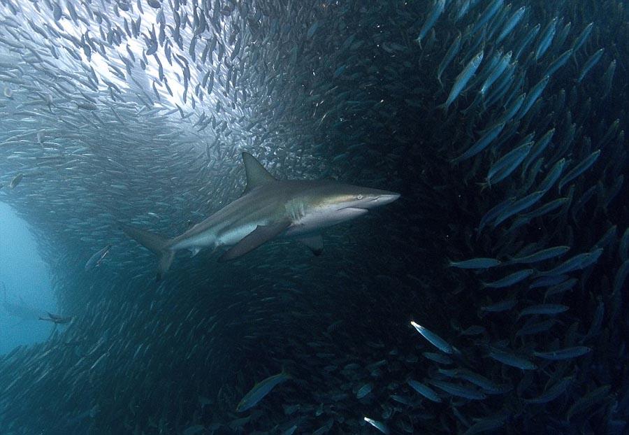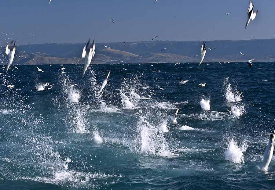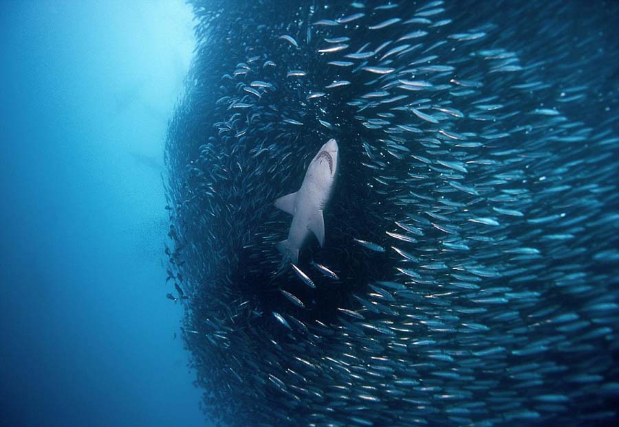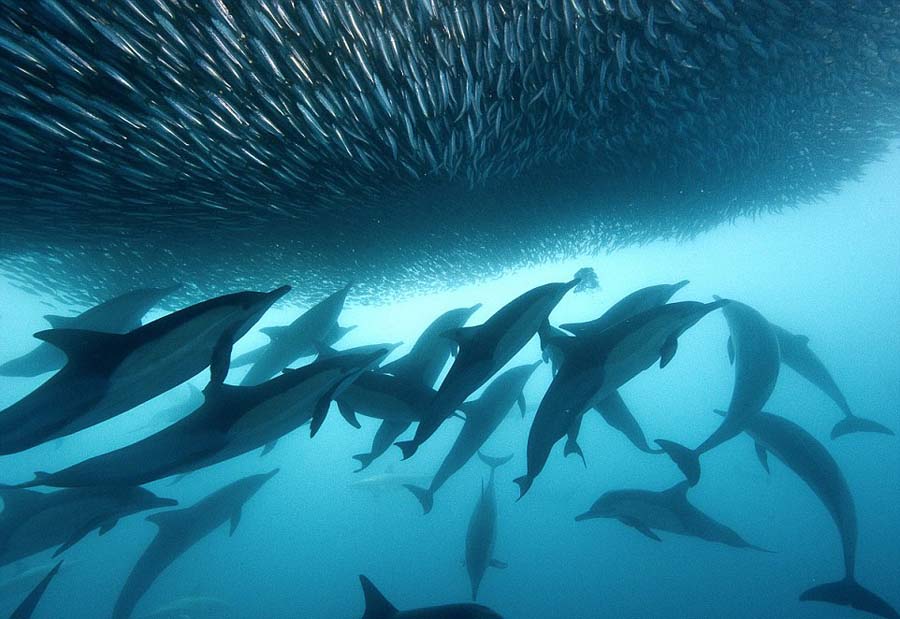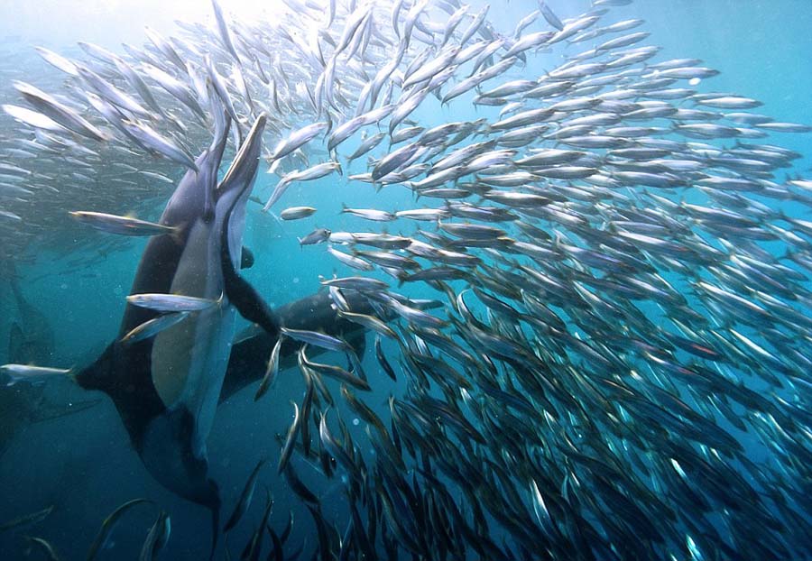 南アフリカ東海岸で撮影されたこの寫真は、イワシ900萬匹が身を守るために群れをなして泳いでいたが、サメやイルカ、クジラといった大型哺乳類や鳥類などに次々と捕食されてしまう様子を捉えている。(編集YH)