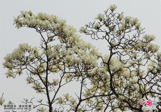 江蘇省連雲(yún)港市東磊村延福観內(nèi)でハクモクレンが満開になった。白い花は雪のように美しく、多くの見物人を魅了した。専門家によると、このハクモクレンの木は今年で樹齢826年を迎える。高さ16.57メートル、直徑3.5メートルで、國內(nèi)で最も大きなハクモクレンの木であり、?中華ハクモクレンの王?と呼ばれている。