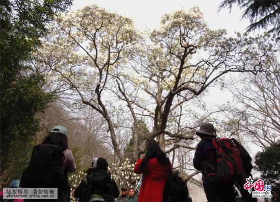 江蘇省連雲(yún)港市東磊村延福観內(nèi)でハクモクレンが満開になった。白い花は雪のように美しく、多くの見物人を魅了した。専門家によると、このハクモクレンの木は今年で樹齢826年を迎える。高さ16.57メートル、直徑3.5メートルで、國內(nèi)で最も大きなハクモクレンの木であり、?中華ハクモクレンの王?と呼ばれている。