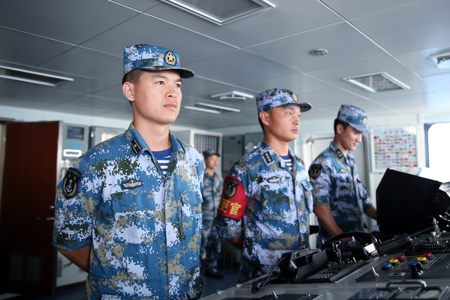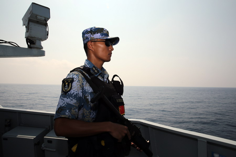 アデン灣海域を航行する「濰坊」甲板で訓練を行う中國海軍陸戦隊員艦載ヘリコプターのパイロット艦上で警戒に當たる中國海軍陸戦隊員操舵室での將兵