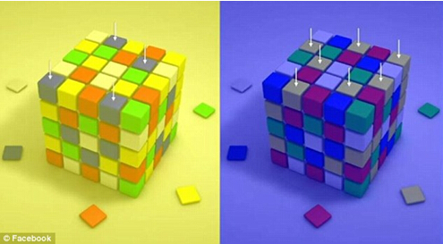 それから寫真のルービックキューブについてだが、矢印で示されている部分はいずれも同じ灰色だが、背景の色が異なるため青と黃色に見える。