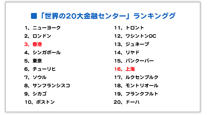 ■「世界の20大金融センター」ランキング発表 香港第3位、上海第16位