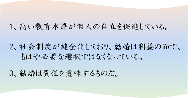 伝統(tǒng)に逆らうようなこうした日本人女性の結(jié)婚観は、一日二日で形成されたものではない。弱小グループとしての彼女たちにとって、結(jié)婚しない選択は社會的に大きなプレッシャーを受けることとなる。なぜますます多くの日本人女性が巨大なプレッシャーにも関わらず結(jié)婚しないことを選ぶのか?