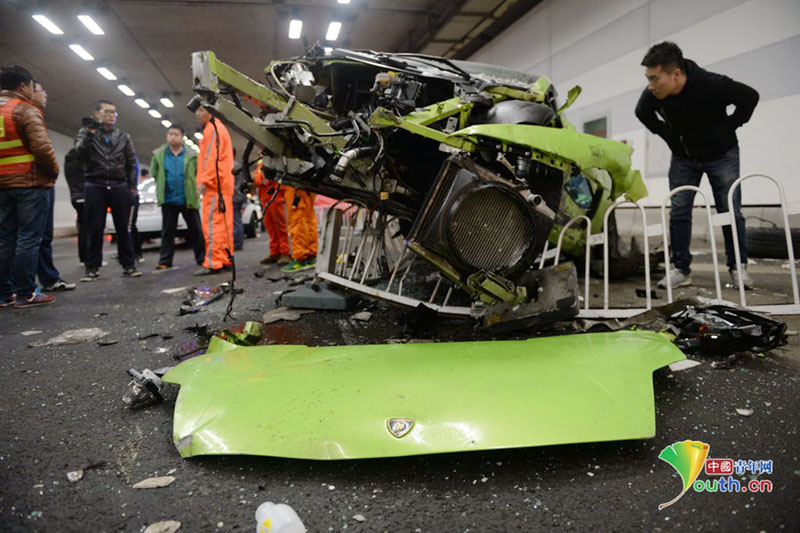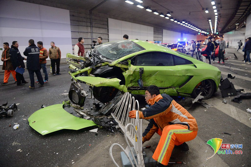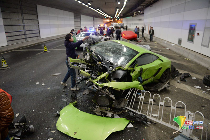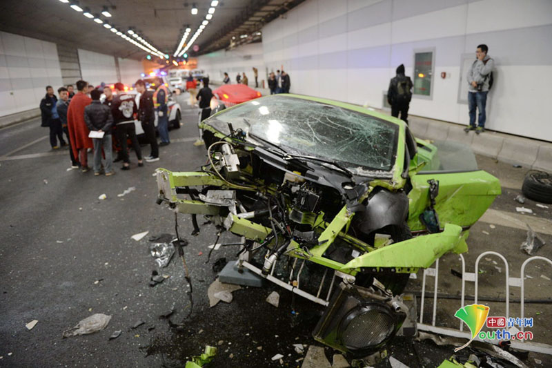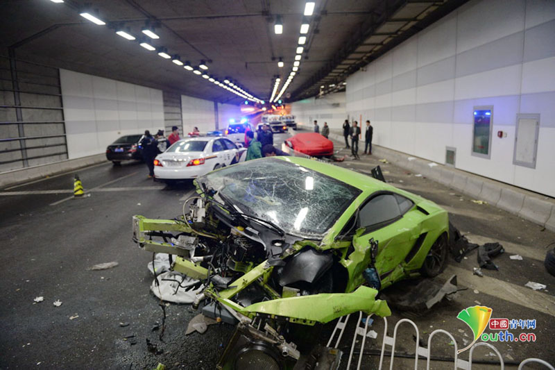 北京市朝陽區(qū)大屯路のトンネルで11日午後10時ごろ、重大事故が発生した?,F(xiàn)場では緑色のランボルギーニの車體前部は完全につぶれ、別の赤いフェラーリは右側(cè)のドアが脫落していた。北京市交通管理局によると、事故発生時車はトンネルの壁と道路脇のガードに衝突したという。事故で乗車していた1人が負(fù)傷した。新京報(bào)が伝えた。