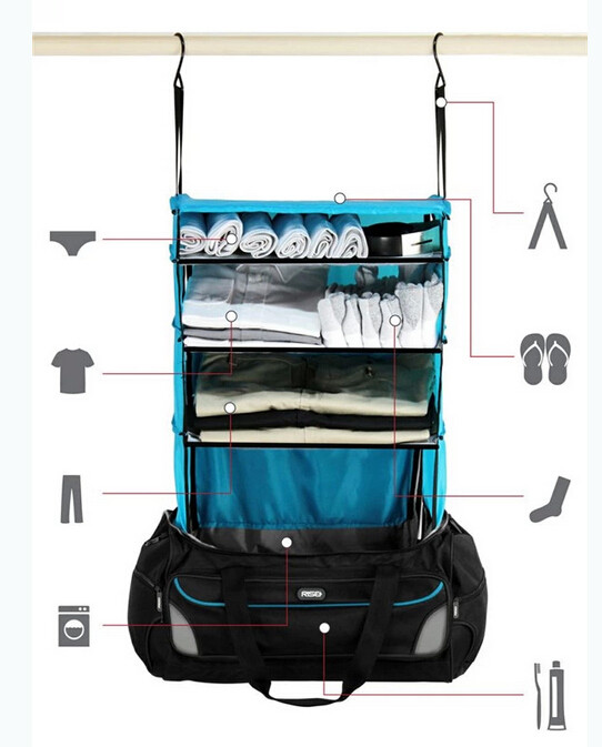 吊り下げフック付きバッグ。出発前に荷物を整理し、到著後に吊り下げて使うことが可能