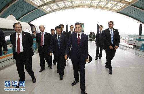 上海でリニアを體験するメキシコのペニャ?ニエト大統(tǒng)領(lǐng)。