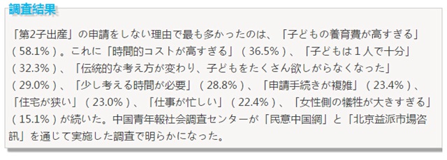 「80後(1980年代生まれ)」と「90後(1990年代生まれ)」の調(diào)査対象者のうち、「子供はいらない」あるいは「こどもは一人で十分」、すなわち「2人目はいらない」と答えた人の割合は56.8%と、回答者全體の割合(47.3%)よりずっと高かったことだ。>>
