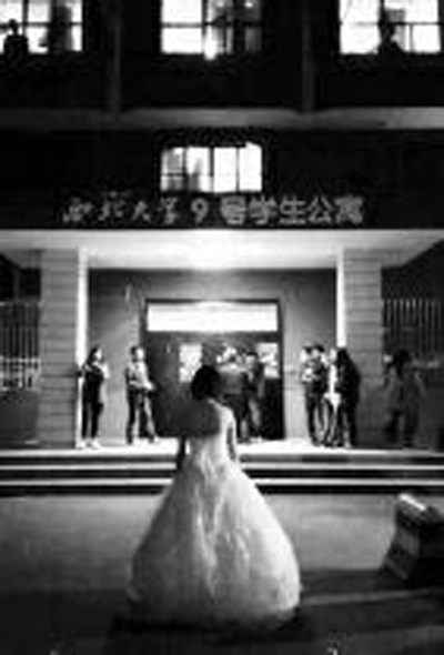 彼氏と3年前に出會(huì)ったという張さんは、「當(dāng)時(shí)、私は學(xué)生で、彼は働いていた。私は卒業(yè)後、実家がある西安に戻り、彼は私と一緒にいるために、試験を受けて西北大學(xué)の大學(xué)院生になった。とても感動(dòng)した。でも、けんかして分かれたこともある。よりを戻してからも、家庭のことが原因でけんかして、彼も動(dòng)揺するなど、ストレスを抱え、ここ數(shù)日は連絡(luò)もしてこなかった。ポジティブに考えてほしいと思って、大學(xué)に來てプロポーズした。著ていたウエディングドレスは友人に借りた」と説明した。
